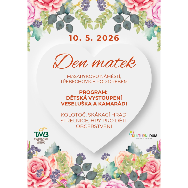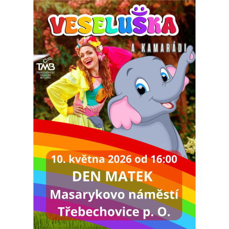 Připravili jsme pro vás den plný radosti a zábavy. Přijďte oslavit svátek maminek a užijte si atrakce (kolotoč, střelnici, skákací hrad), občerstvení a kulturní program. Na podiu tradičně popřejí maminkám děti z Rodičovského centra Domeček, Mateřské školy, Základní školy, Základní umělecké školy a Domu dětí a mládeže. Za jejich milá přání dostanou děti zaslouženou odměnu v podobě zábavného programu víly Veselušky, která vystoupí v 16 hodin. A nebude sama! Veseluška s kamarádkami beruškami a sloníkem Toníkem zazpívají originální písničky, zatančí si společně s dětmi veselé tanečky a nabijí publikum pozitivní energií.